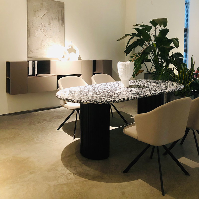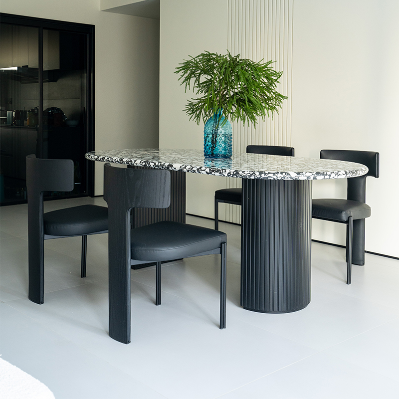 A dining table with a retro vibe, featuring a floral cow terrazzo that is warm and fashionable, with black lines and stable and high-end legs