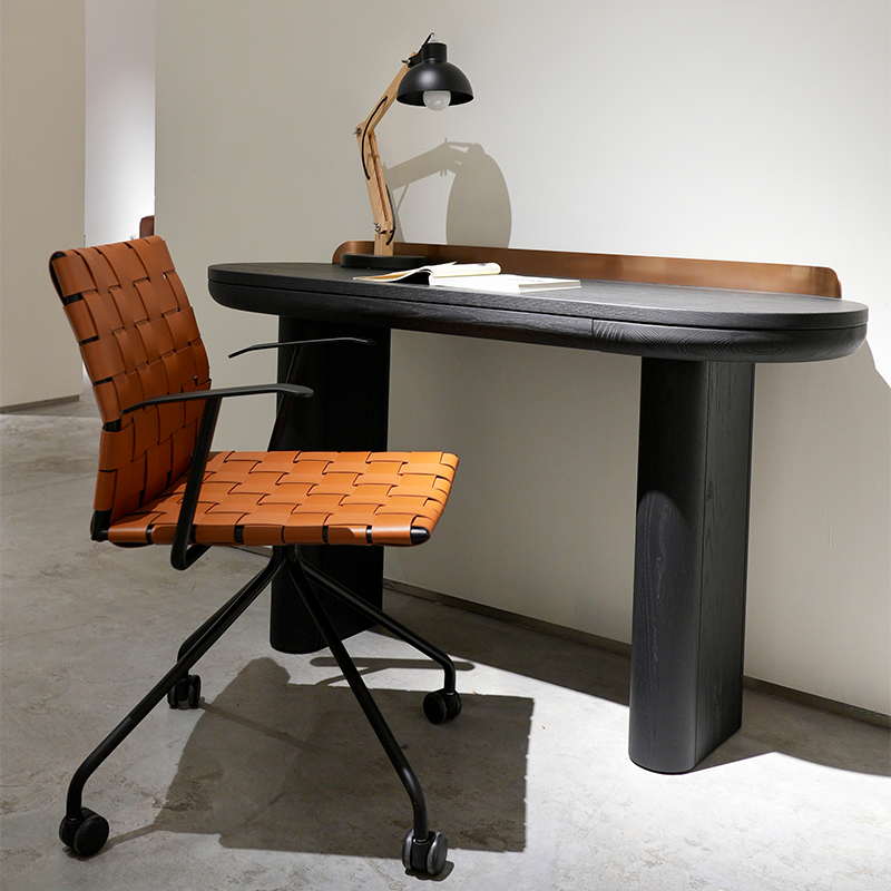 一款带万向轮的椅子,马鞍皮编织和金属椅架的结合有着一些复古